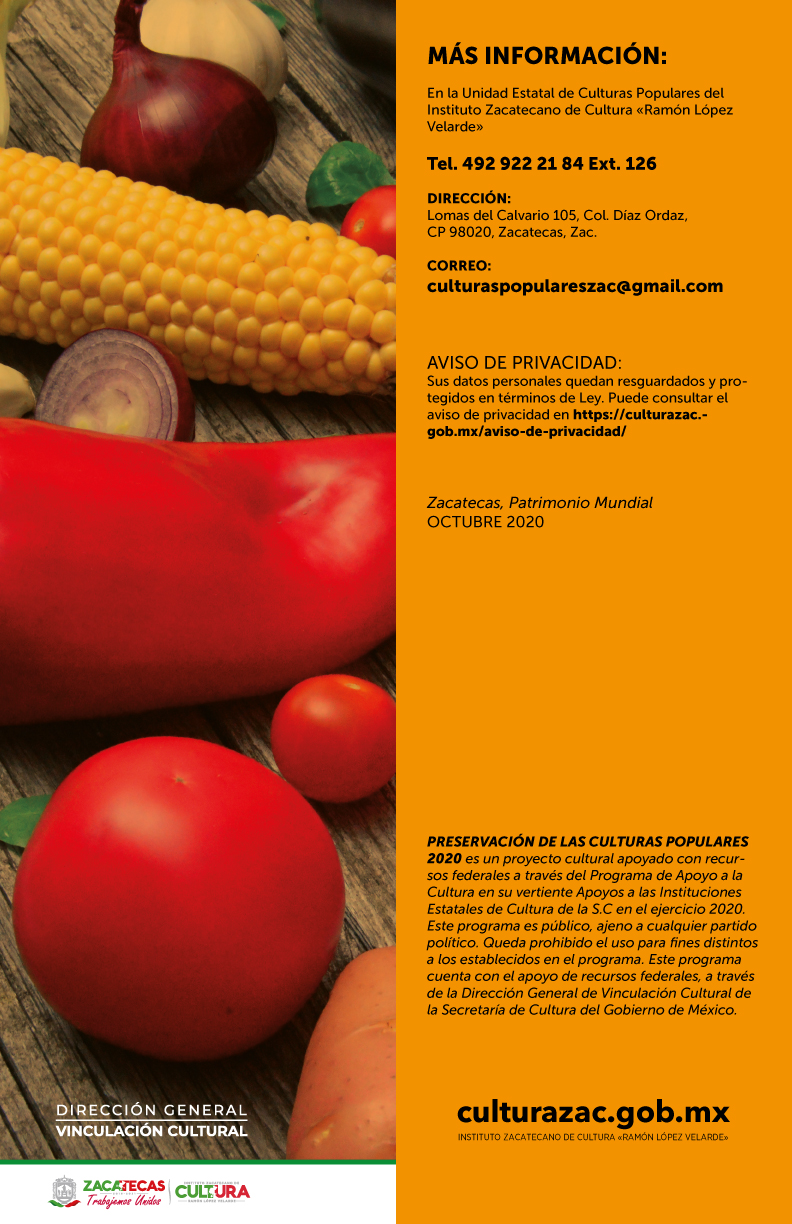 Dicha convocatoria está dirigida a cocineros y cocineras residentes u originarios de Zacatecas con una propuesta consistente en dos videos de recetas artesanales en donde se muestre la preparación del platillo, dulce, panadería o bebida tradicional, que reflejen alguna tradición culinaria de su comunidad, en la que incluyan ingredientes regionales o endémicos, con uso de técnicas y utensilios artesanales.
