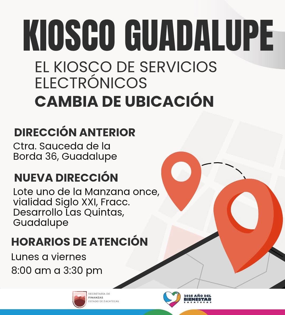 -Asimismo, el Kiosco de Servicios Electrónicos de Guadalupe, que anteriormente se encontraba en la Carretera Sauceda de la Borda, cambió de ubicación al Lote Uno de la Manzana Once, Vialidad Siglo XXI, Fraccionamiento Desarrollo Las Quintas, en el municipio de Guadalupe.