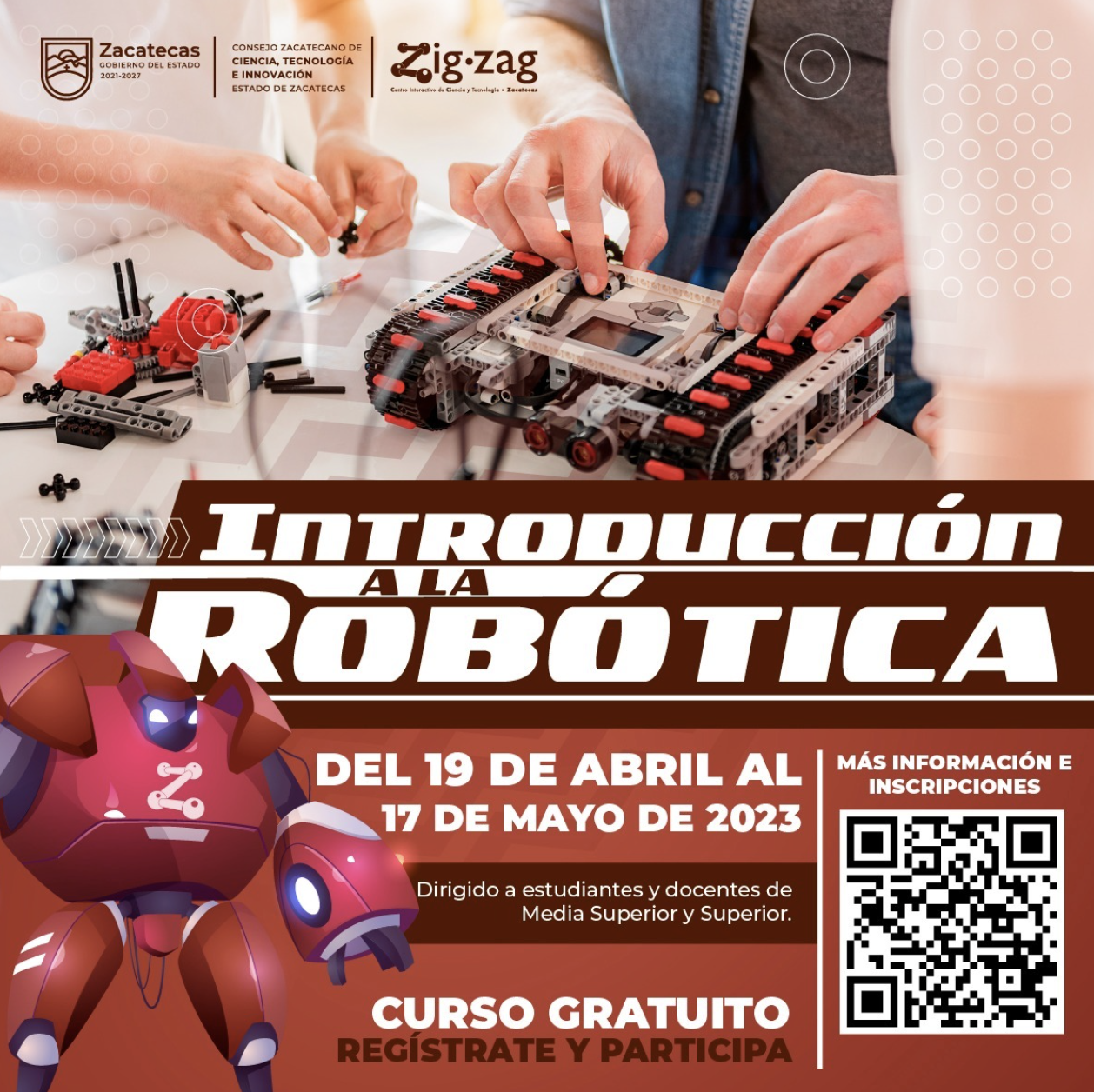 Zacatecas, Zac., 11 de abril de 2023.- Con el propósito de fomentar el interés de la juventud por la tecnología e innovación, el Gobierno del Estado, que encabeza el mandatario David Monreal Ávila, convoca a estudiantes y docentes de nivel medio superior y superior a participar en el Curso Introducción a la Robótica, que desarrollará el Centro Interactivo de Ciencia y Tecnología de Zacatecas Zigzag.