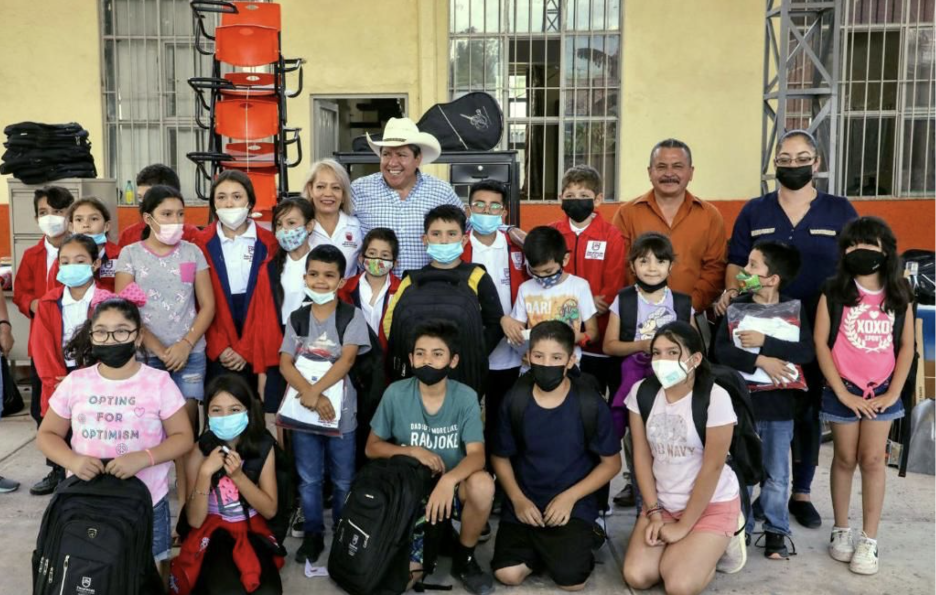 Después de haber recibido por parte del Gobernador, previamente a este día, tres camiones de material para la construcción de dos aulas y, hoy, uniformes, balones, bicicletas, cubetas de pintura, mobiliario, mochilas, útiles escolares, kits de limpieza y pizarrones, el Director ofreció el respaldo absoluto al trabajo de David Monreal.