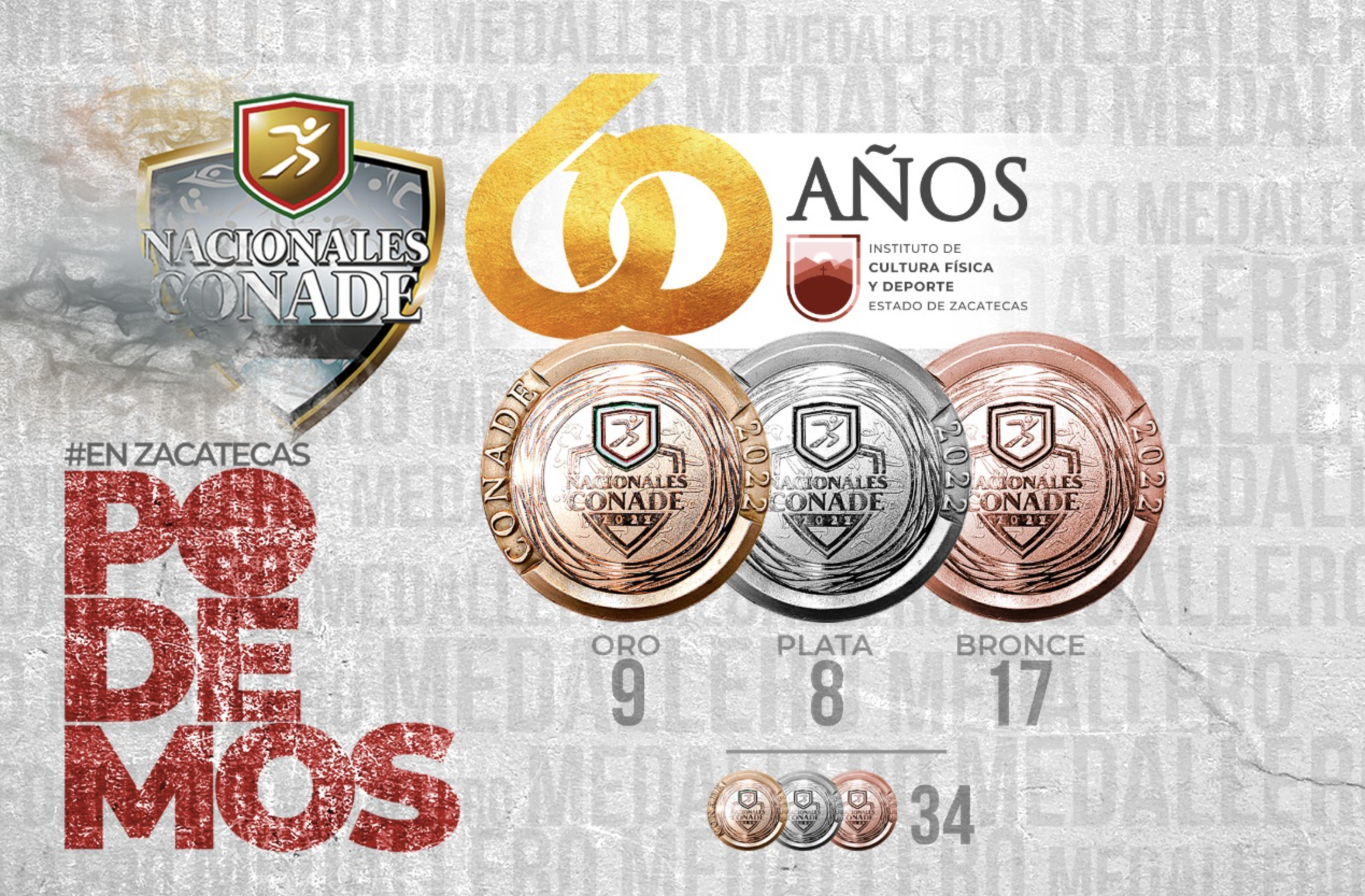 Zacatecas, Zac., 23 de junio de 2022.- Hasta el momento, la delegación de Zacatecas se ubica en la posición 23 en los Juegos Nacionales Conade 2022, con la cosecha de nueve medallas de oro, ocho de plata y 17 de bronce, para un total de 34 preseas.
