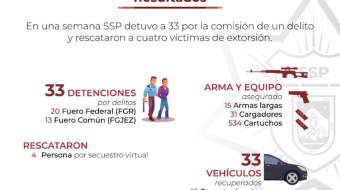 Zacatecas, Zac., 17 de noviembre del 2021.- Como resultado del trabajo continuo desplegado por las corporaciones policiales de la Secretaría de Seguridad Pública (SSP), en la semana comprendida del 8 al 14 de noviembre, se logró la detención de 33 personas por la comisión de un delito; 20 de ellas fueron puestas a disposición del Ministerio Público federal y 13 al estatal.