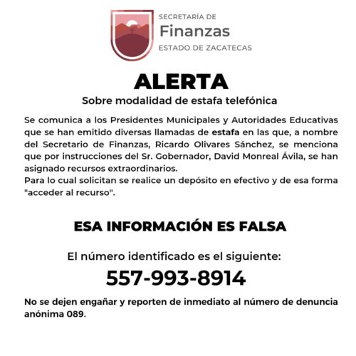 Ricardo Olivares externó que, a través de la línea telefónica 557-993-8914, llaman a nombre del titular de la Sefin para informar que, por indicaciones del Gobernador David Monreal Ávila, se han asignado recursos extraordinarios a los Municipios e instituciones educativas.