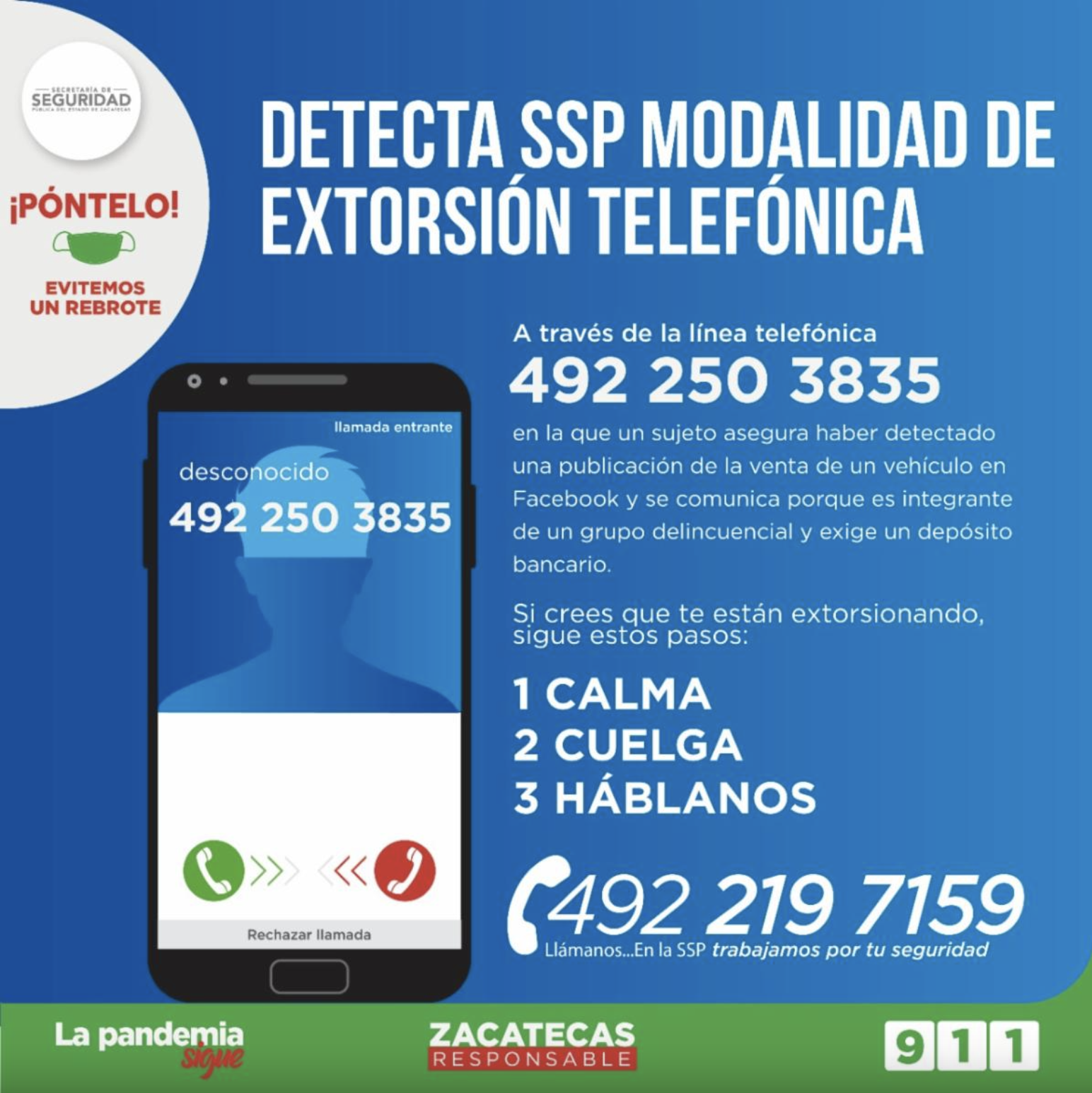 Por lo anterior, la SSP da a conocer este número telefónico para que las y los zacatecanos permanezcan atentos y eviten caer en engaños y ser víctimas de este tipo de delitos; además, los exhorta a que, en caso de recibir estas llamadas, cuelguen y denuncien de inmediato a las corporaciones de la SSP, para que puedan actuar.