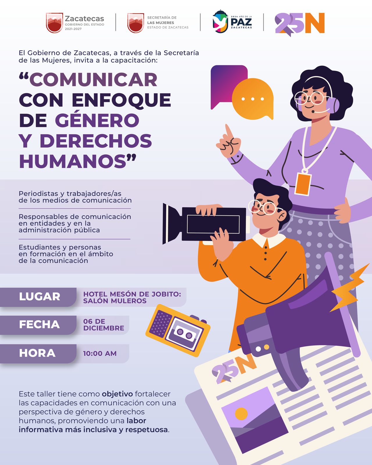 Zacatecas, Zac., 4 de diciembre de 2024.- Con el objetivo de fortalecer las capacidades en comunicación desde una perspectiva de género y derechos humanos, el Gobierno de Zacatecas, a través de la Secretaría de las Mujeres, invita a periodistas, trabajadoras y trabajadores de medios de comunicación, responsables de comunicación en entidades públicas y estudiantes, a participar en la capacitación “Comunicar con Enfoque de Género y Derechos Humanos”.