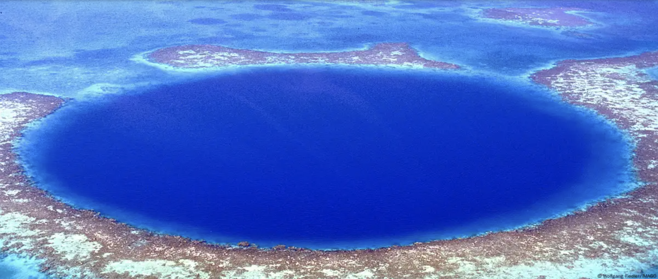 A 80 kilómetros de la costa de Belice, en el atolón del arrecife Lighthouse, se encuentra este impresionante sumidero marino: un círculo perfecto de aguas azul oscuro que desciende abruptamente hasta 125 metros de profundidad. Este sumidero submarino de 300 metros de diámetro comenzó como una cueva de piedra caliza que, tras el colapso de su techo durante la última glaciación, se transformó en el extraordinario archivo natural climática de la región.
