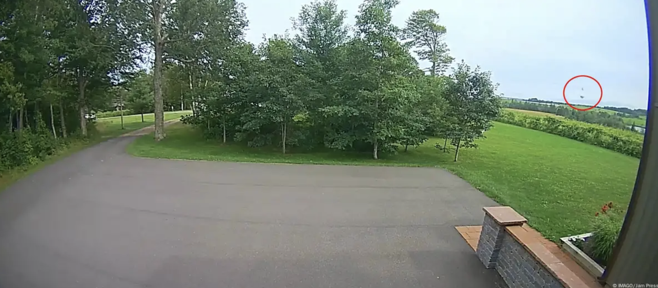 El suceso quedó registrado en la cámara Ring de su puerta, capturando tanto las imágenes como el estruendo del impacto, que según testigos, sonó "como un disparo fuerte y estrepitoso", informó The Canadian Press.